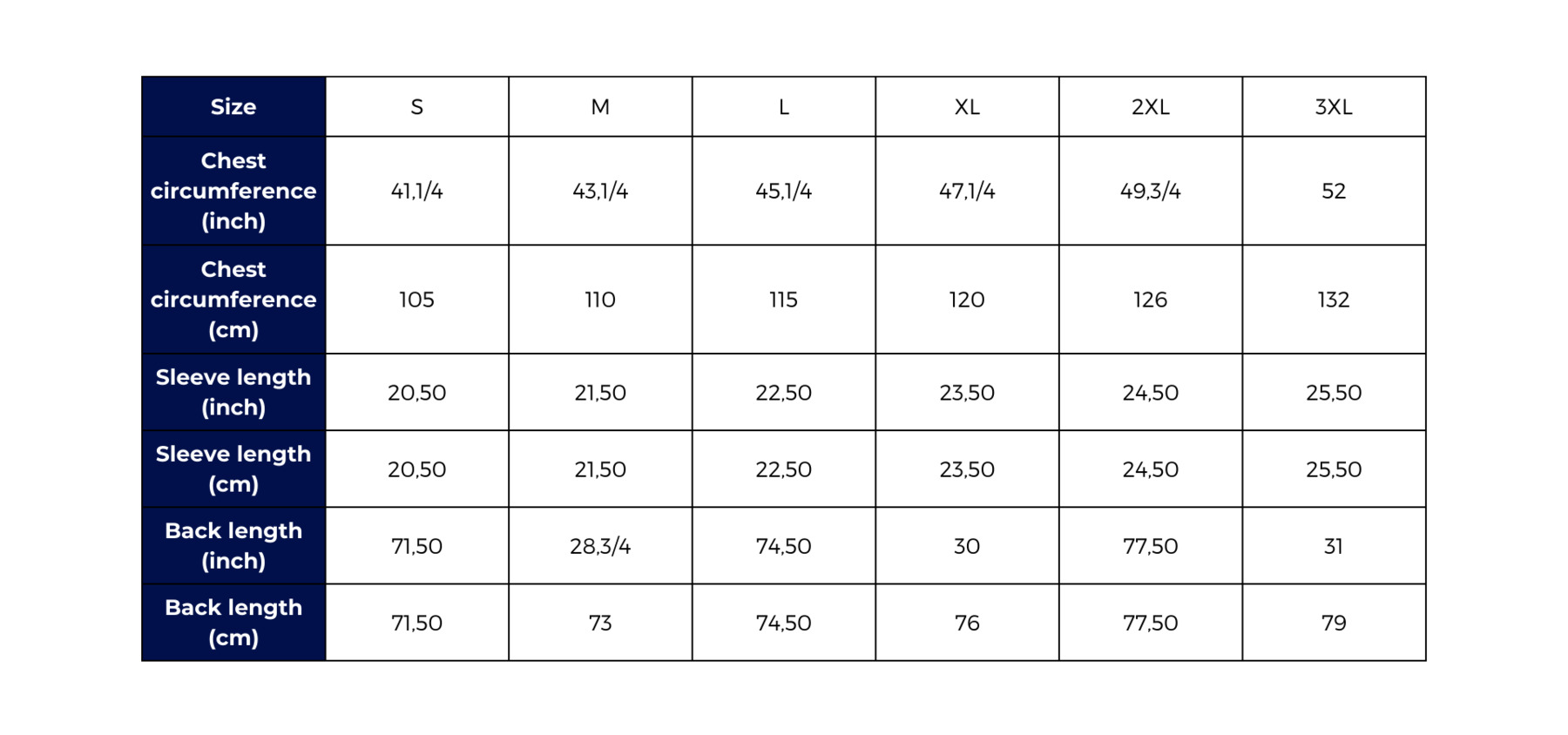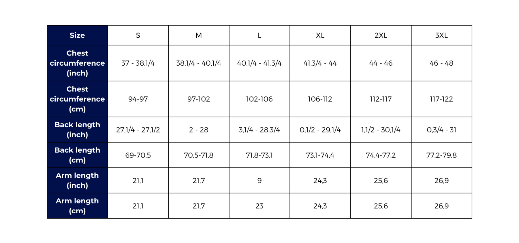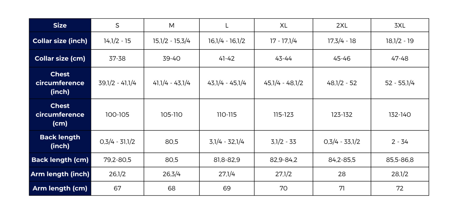Size guide Poloshirts