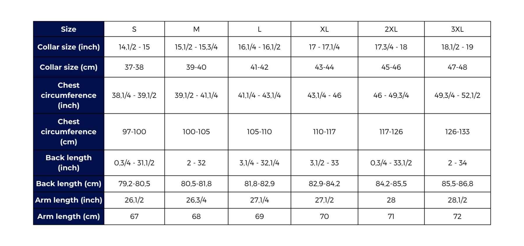 Size guide Shirts Slim-Fit